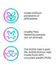 - Pro jistotu s ohledem na budoucnost: Vyrobeno bez parabenů a ftalátů. Netestováno na zvířatech. Testováno lidmi, nikoli zvířaty. Láhev (bez víčka) vyrobena z 80 % recyklovaného plastu (PCR).