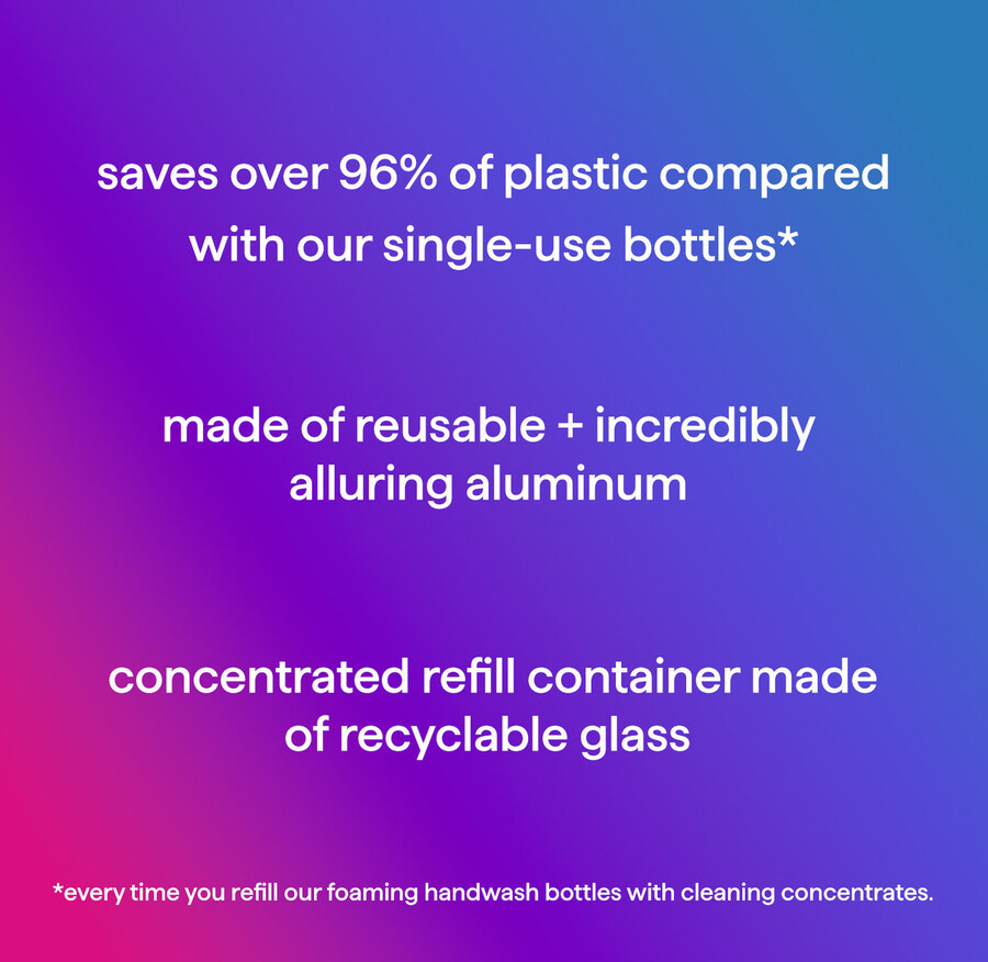 - použití koncentrovaných náplní Method + hliníkové lahve ušetří více než 96 % plastu ve srovnání s našimi jednorázovými plastovými lahvemi.